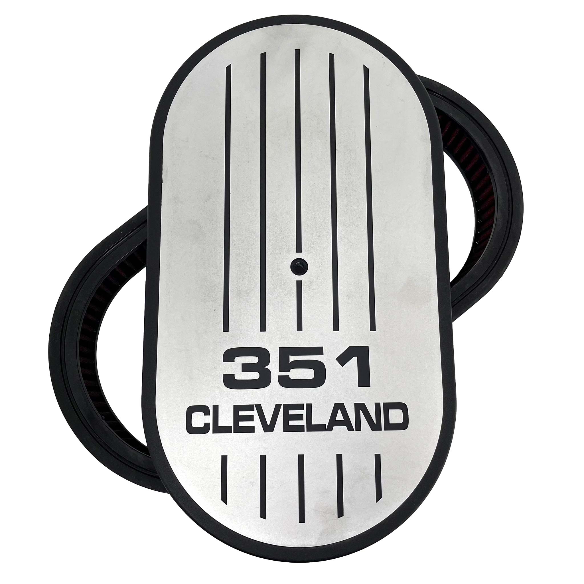 This 351 Cleveland 15" oval air cleaner kit features a sanded top with deep engraved logo and a powder coat finish. Built from high-grade die-cast aluminum.