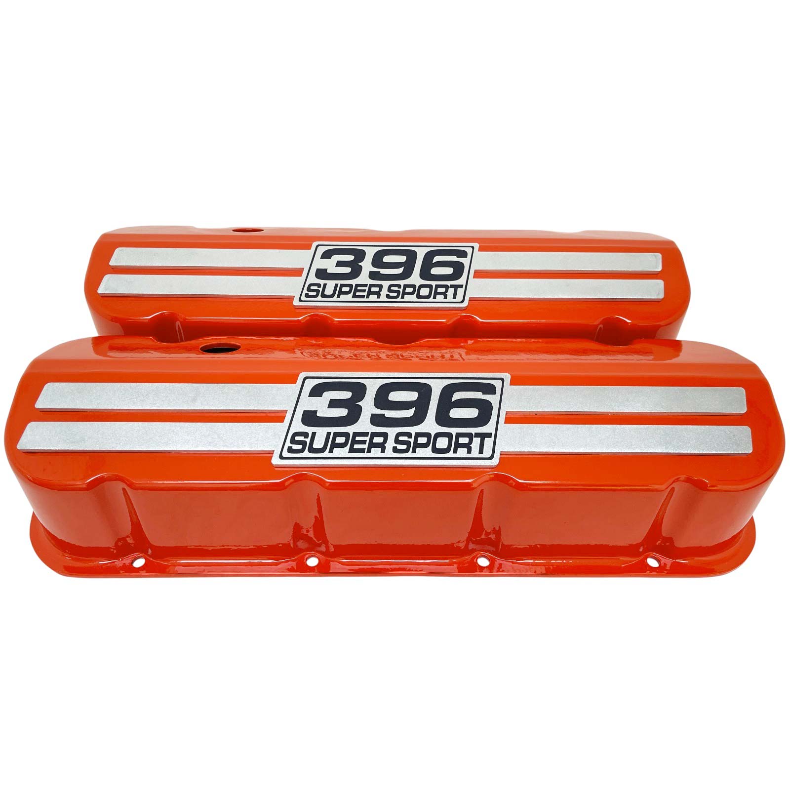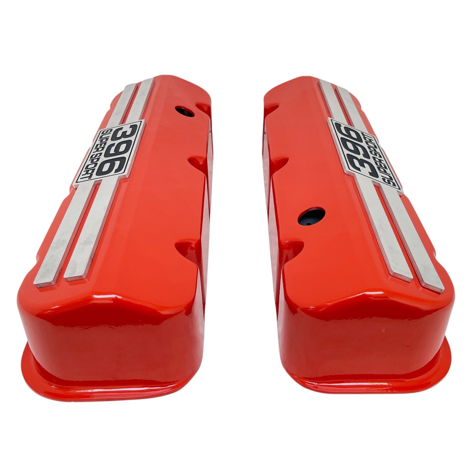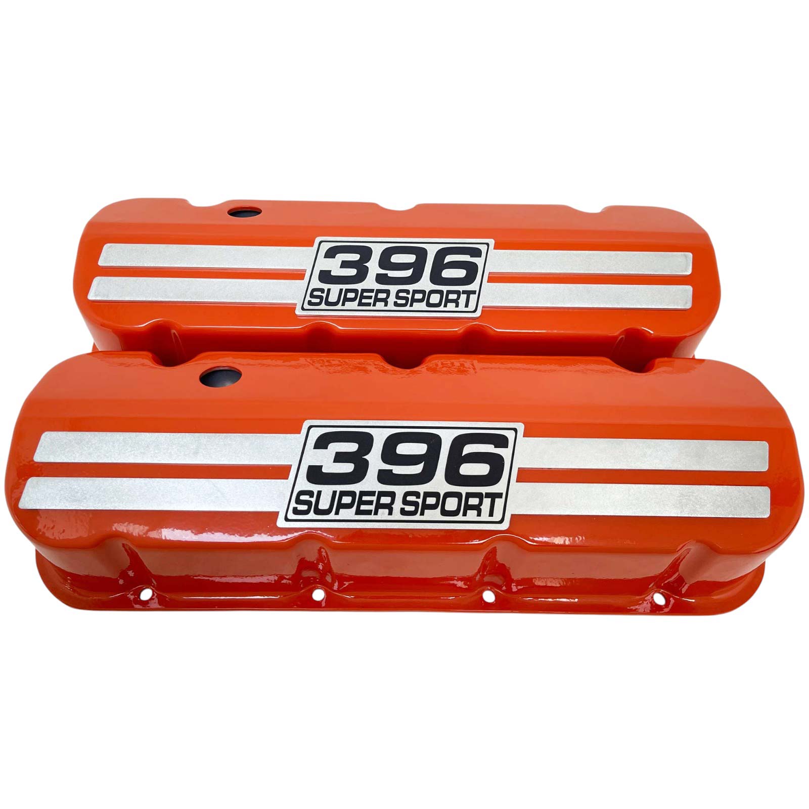These Big Block Chevy 396 Super Sport tall valve covers feature an engraved raised billet top and an orange powder coated finish. Our valve covers are built from high-grade die-cast aluminum.