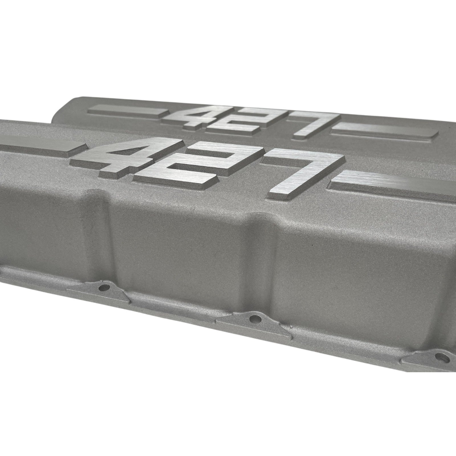 These Big Block Chevy 427 tall slant top valve covers feature a raised logo and a bead blast finish. Our valve covers are built from high-grade die-cast aluminum.
