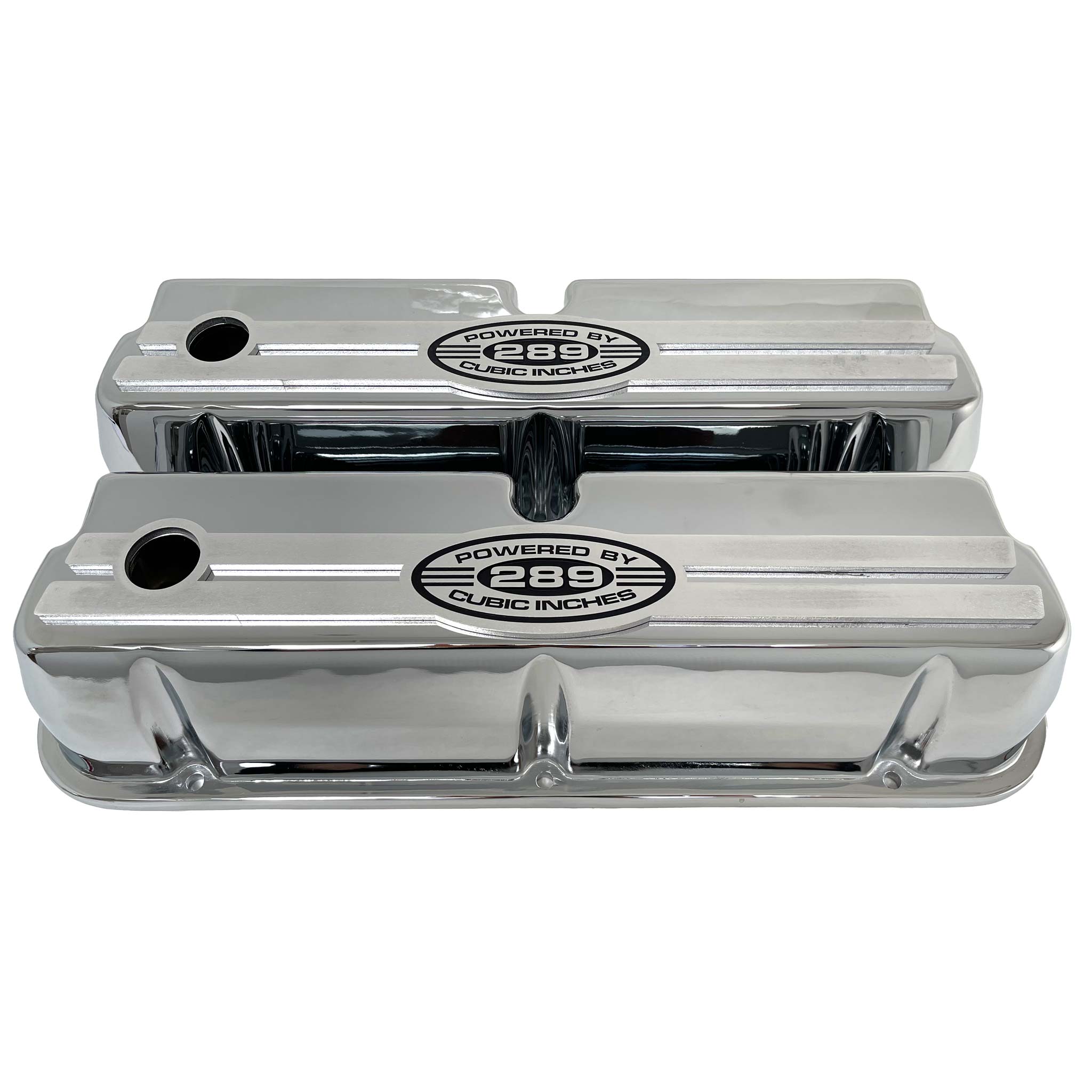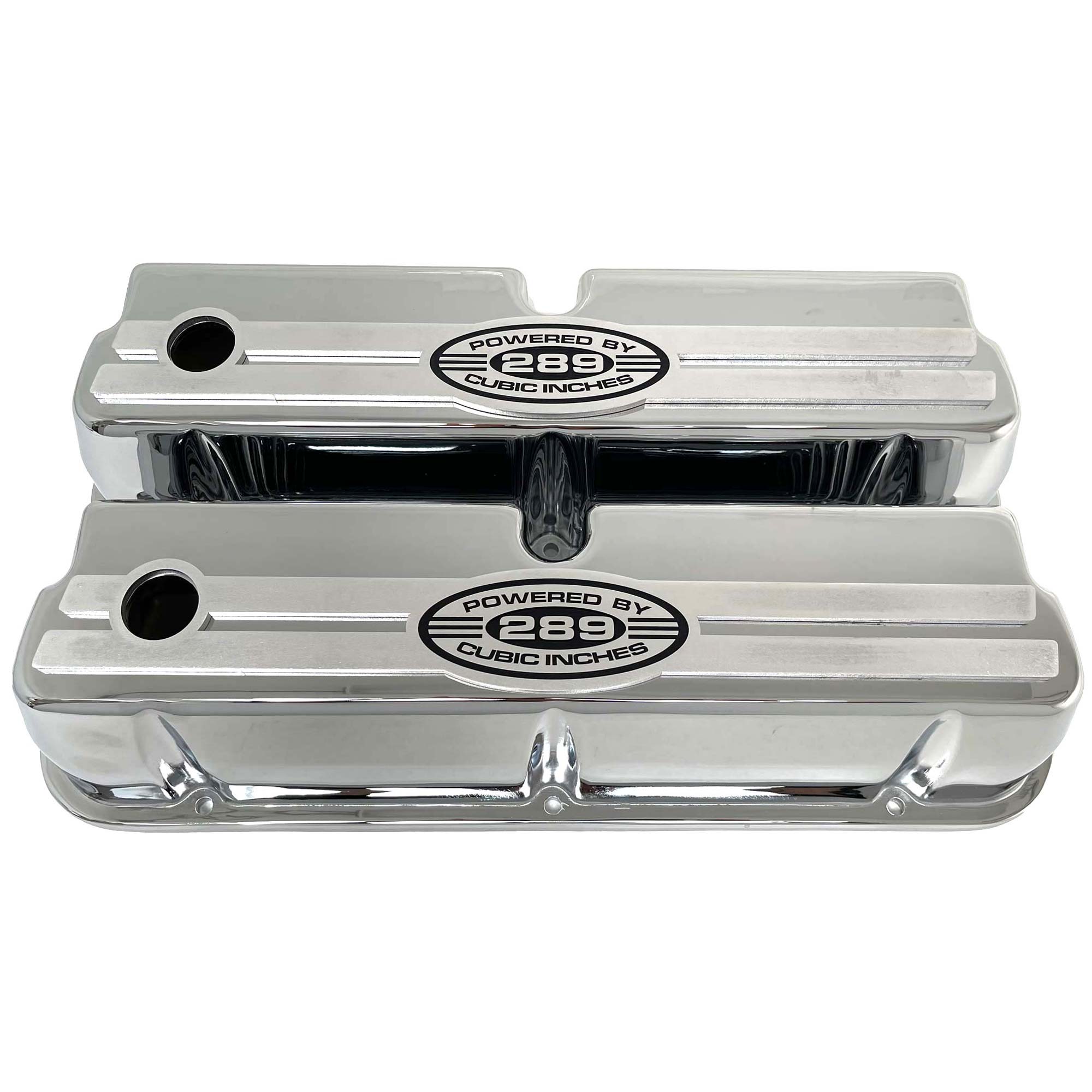 These Ford Small Block 289 Windsor tall valve covers feature a raised, engraved oval billet top and a polished finish. Ansen valve covers are built from high-grade die-cast aluminum.