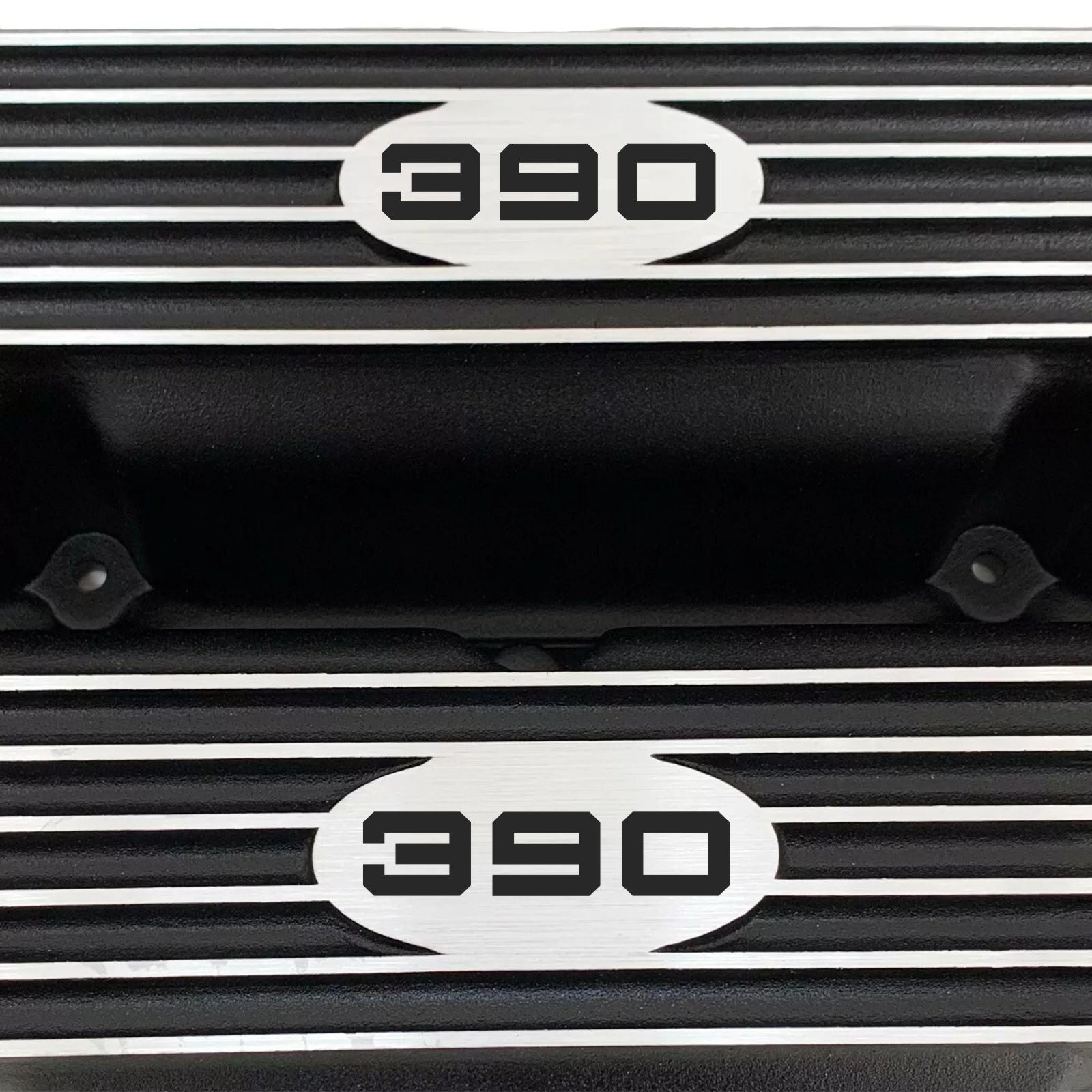 These Ford FE 390 Short finned valve covers feature an engraved logo and a black powder coat finish. Our valve covers are built from high-grade die-cast aluminum.