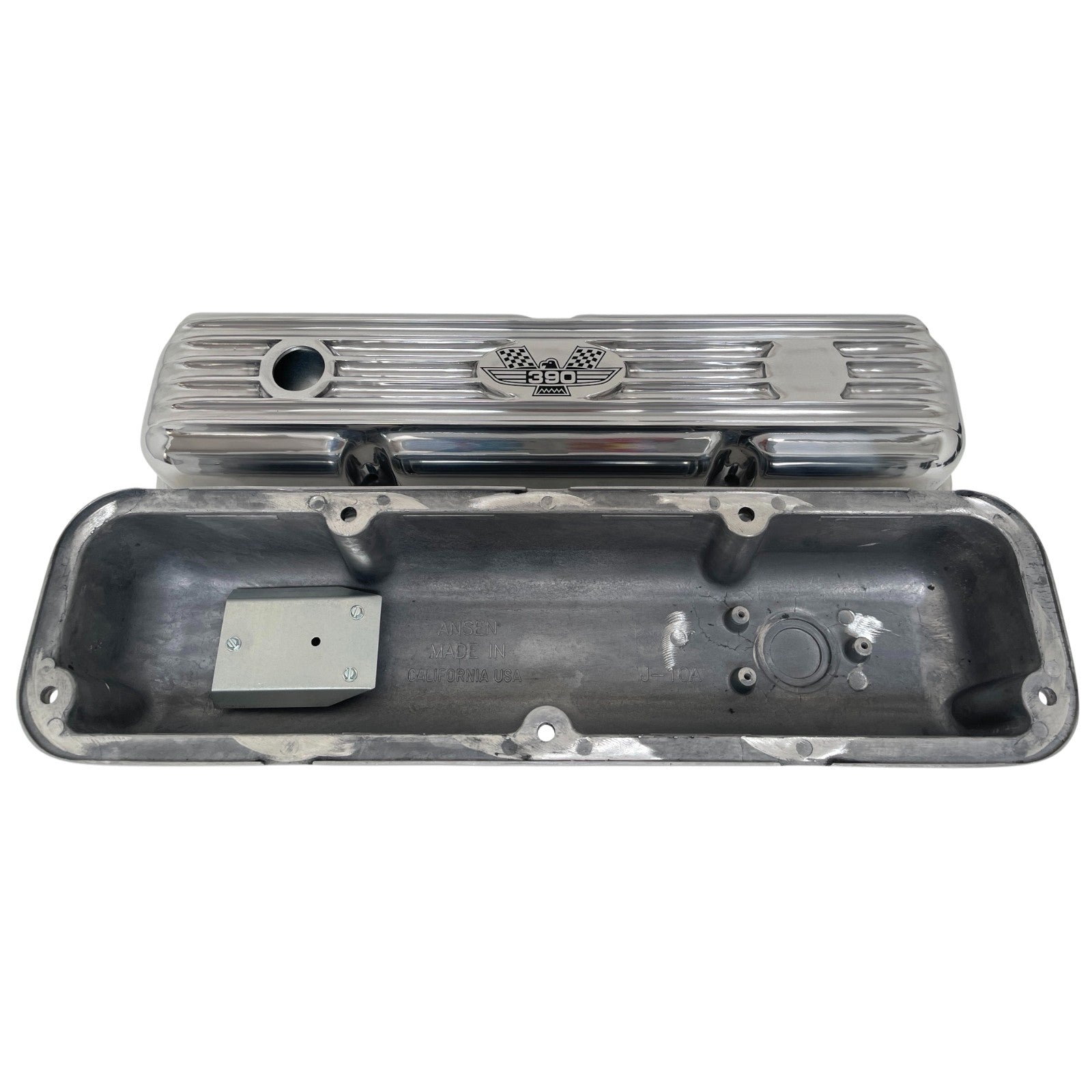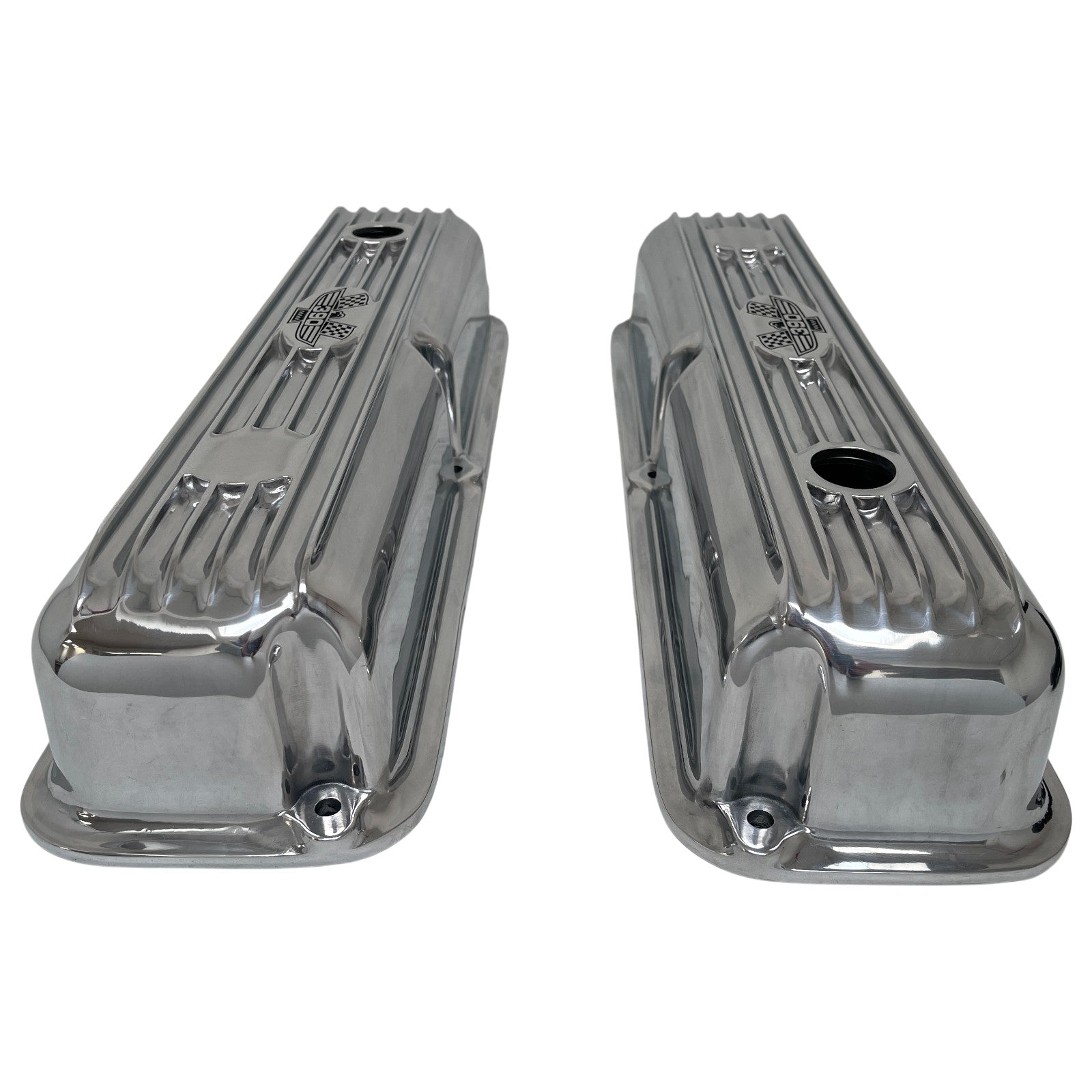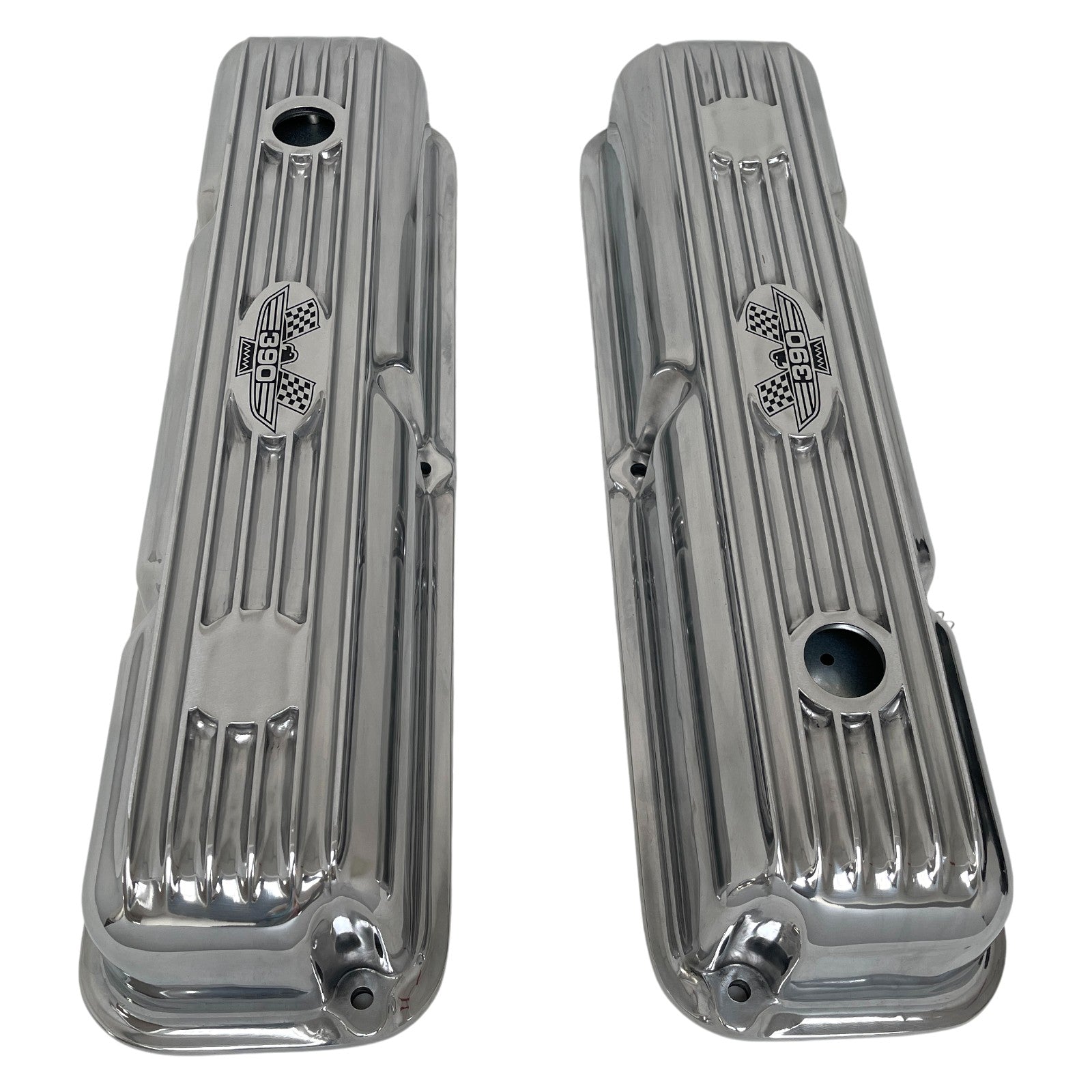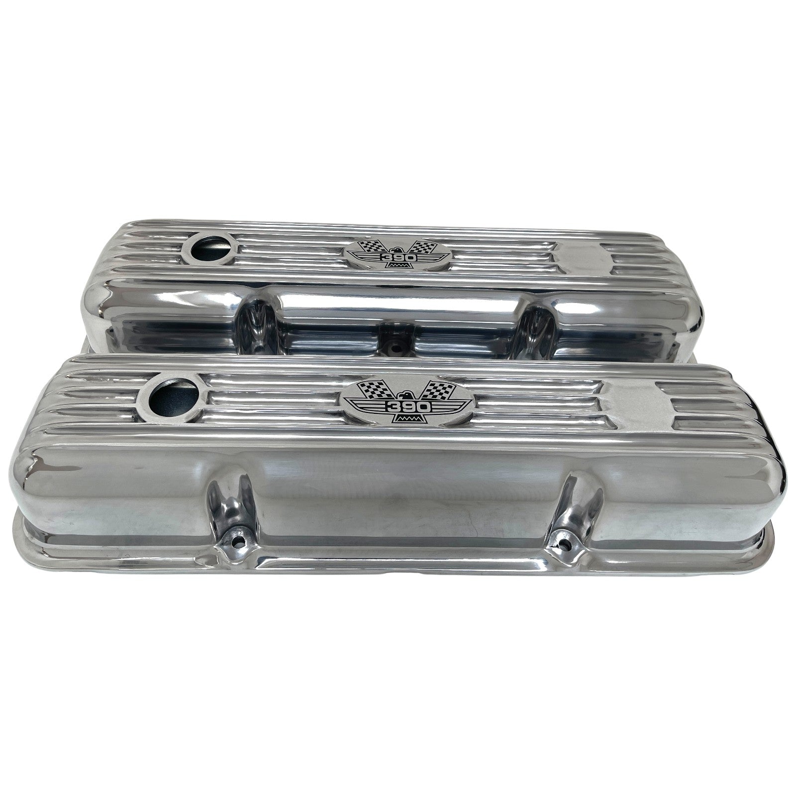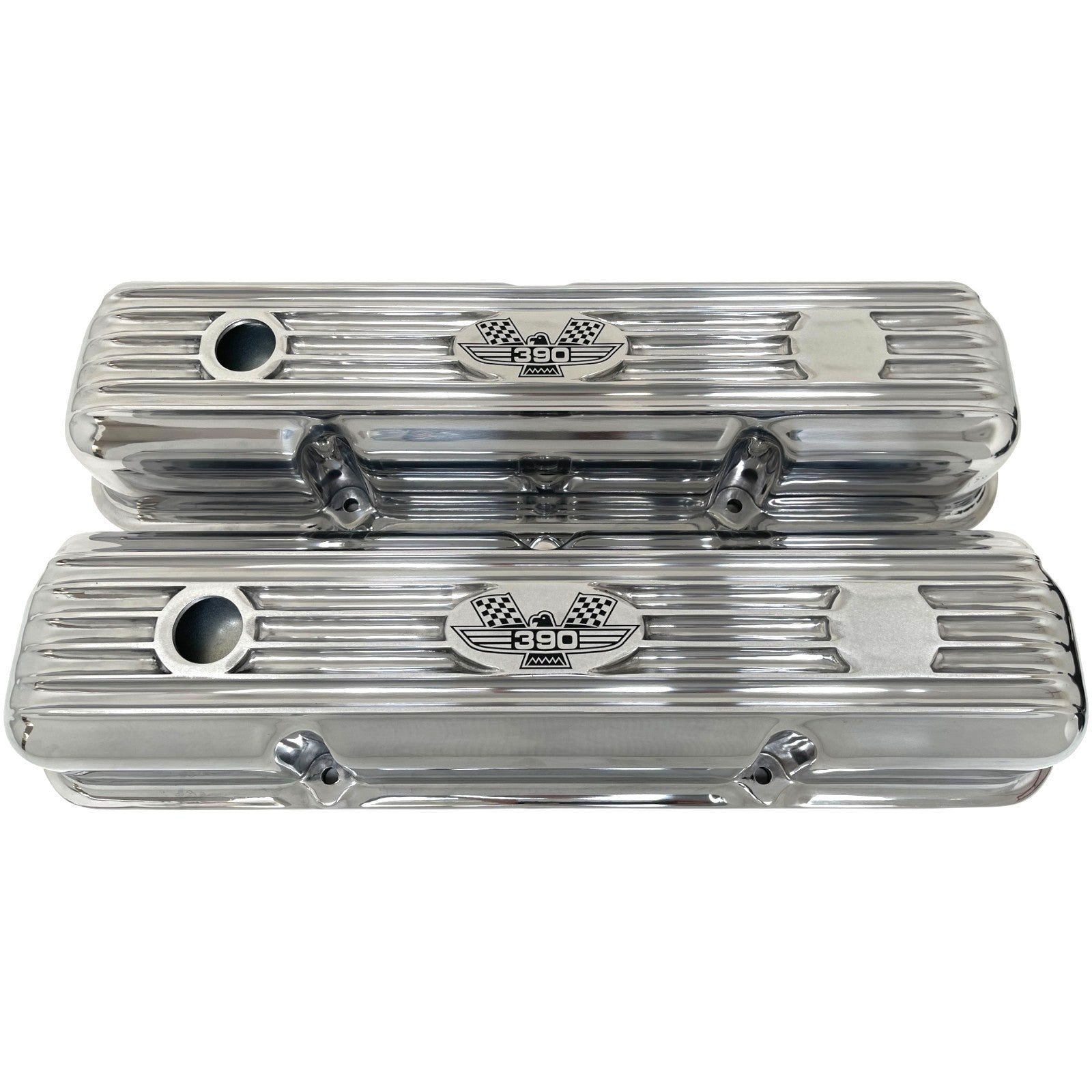 These Ford FE 390 Short finned valve covers feature an engraved American Eagle logo and a polished finish. Our valve covers are built from high-grade die-cast aluminum.