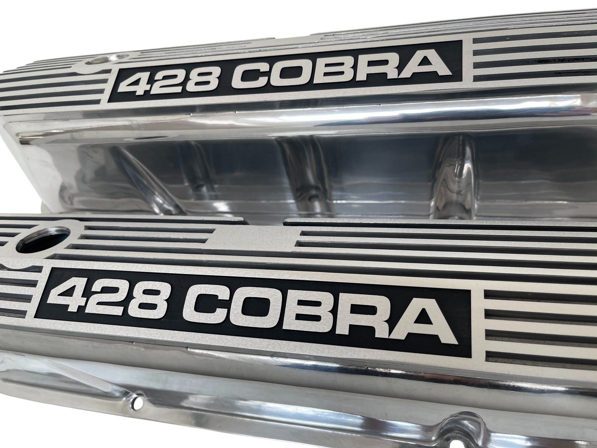 These Ford FE Tall valve covers feature an engraved 428 Cobra logo and a polished finish. Built from high-grade die-cast aluminum.