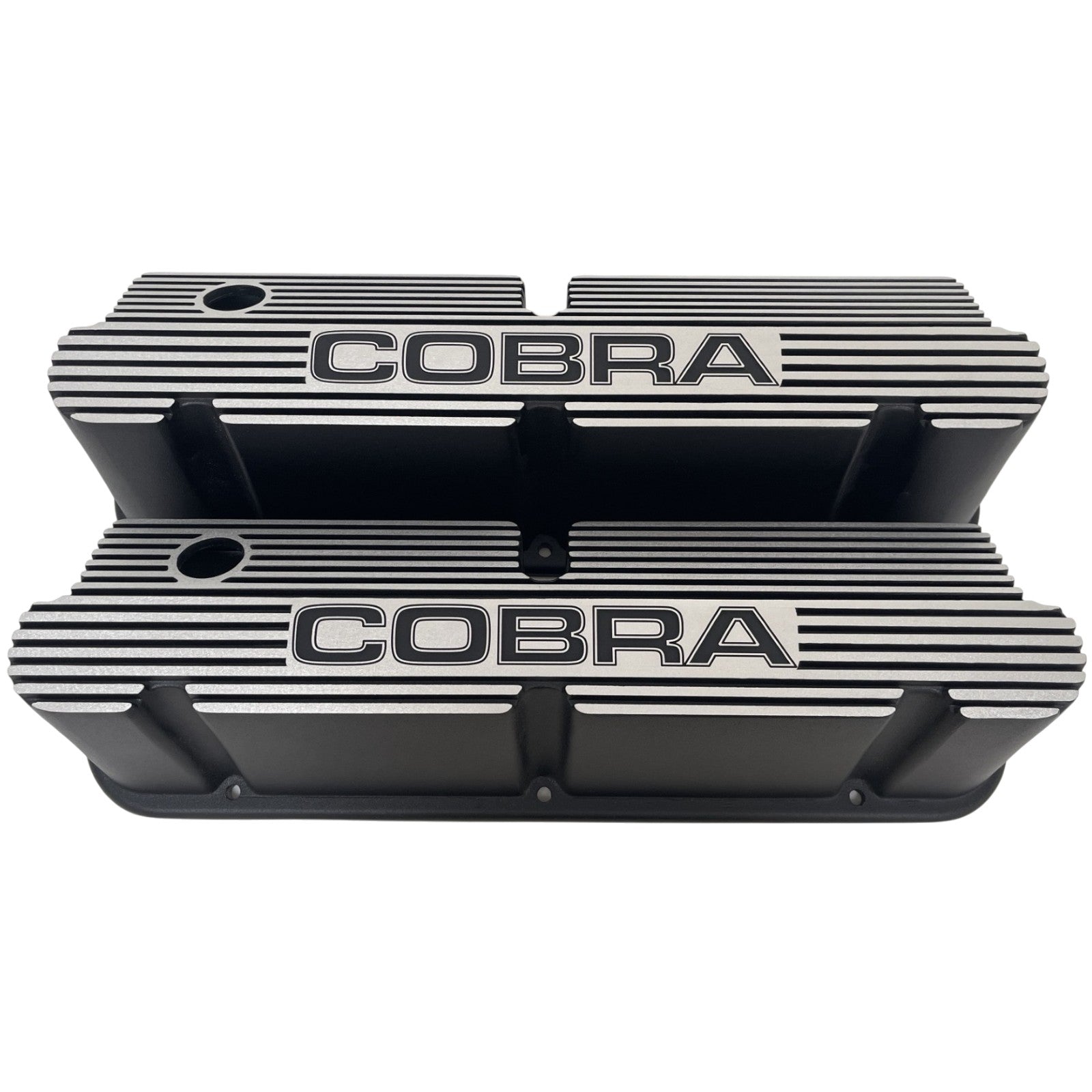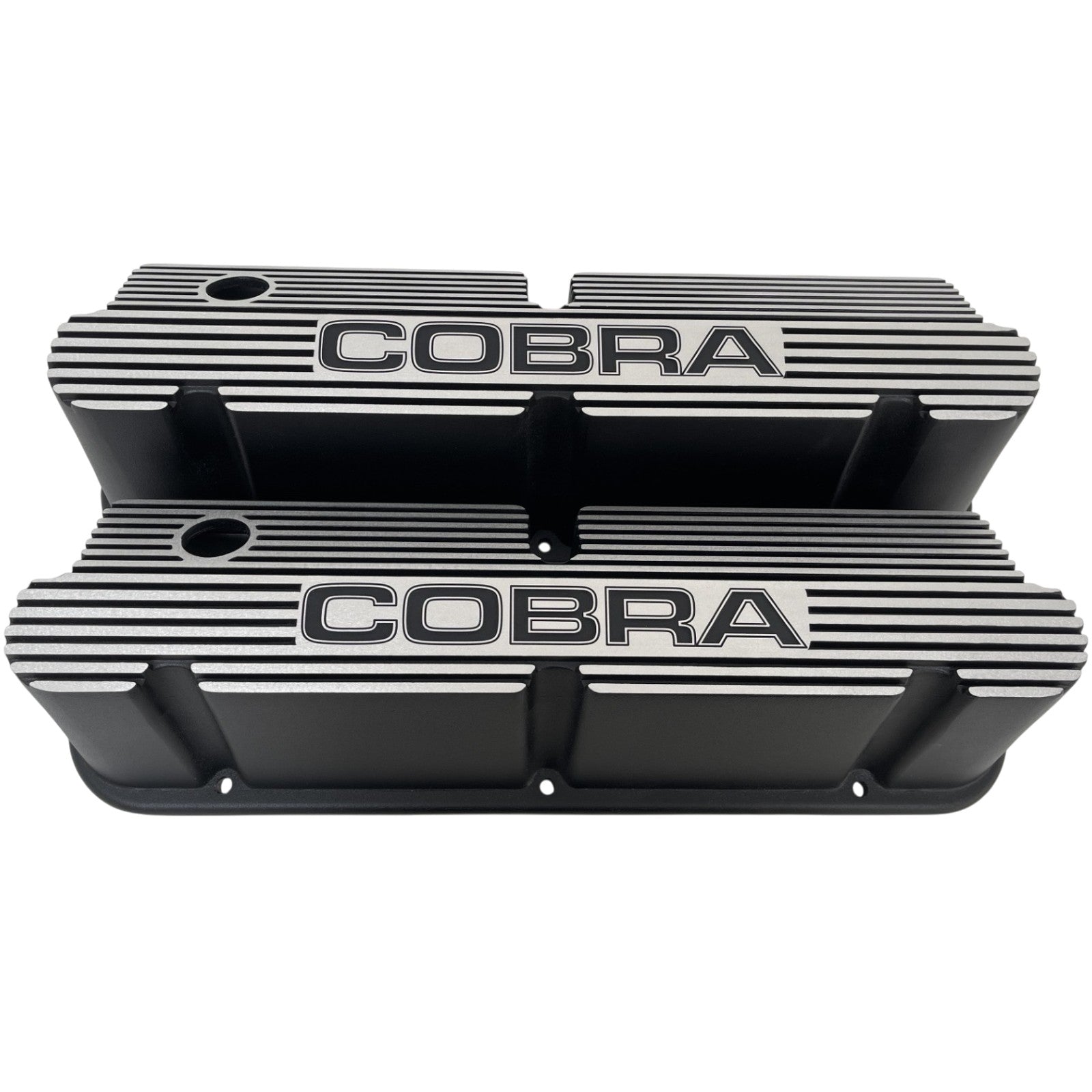 These Ford 351 Windsor Pentroof style valve covers feature an engraved COBRA logo and a black powder coat finish. Ansen valve covers are built from high-grade die-cast aluminum. Designed for the small block Ford engine block. Please refer to measurements and specs below!